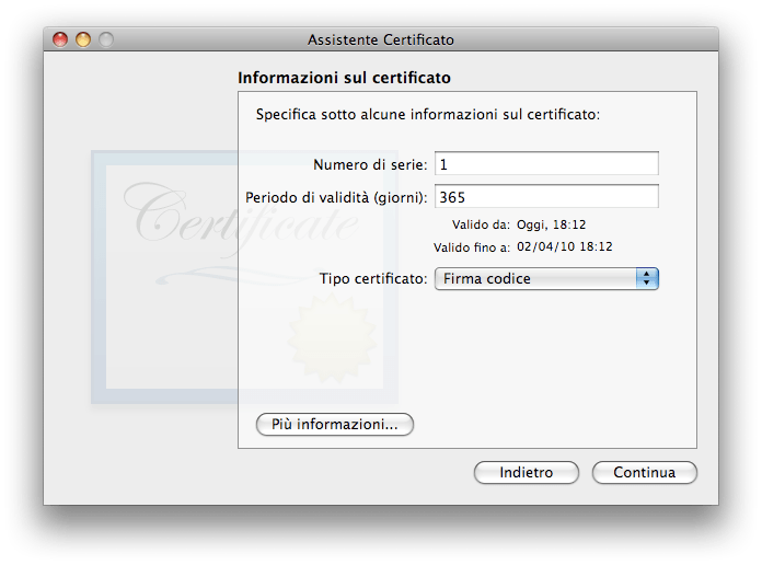2b) Si aprirà ora una schermata, in cui dovremo inserire il nome del certificato. Inseriamo “iPhone Developer“, selezioniamo il tipo “Primo livello autofirmato” e spuntiamo la casella “Lascia che sia io a sovrascrivere i default”.