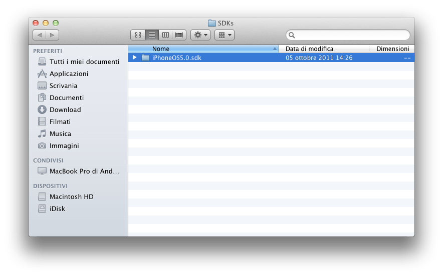 Entrate, poi, nella cartella che riporta la versione dell’SDK che vi serve. Se volete compilare e installare con l’ultima versione disponibile dovrete scegliere la cartella “iPhoneOS5.0.sdk”: